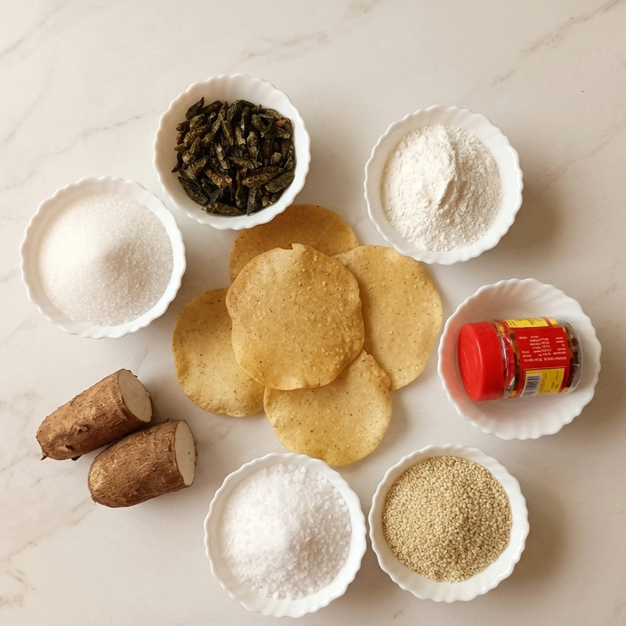 Cassava Papad is a crispy Indian snack made from tapioca root starch, widely enjoyed for its light, airy texture and satisfying crunch. It is a popular choice in many households due to its gluten-free nature and easy digestibility.